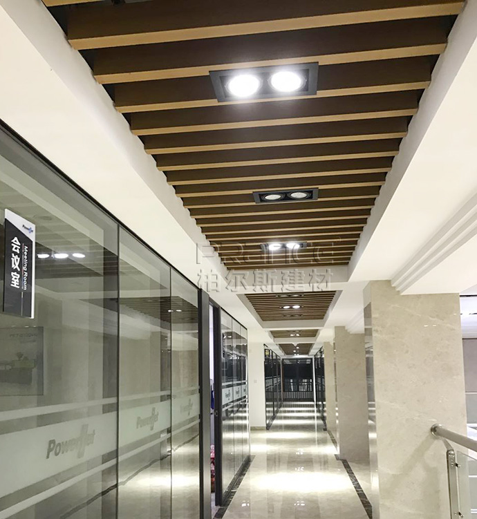 二樓走廊有48米長,為了避免走廊吊頂過于單調(diào),柏爾斯提供的解決方案是采用U型木紋鋁方通,通過木紋色來協(xié)調(diào)一下整個辦公樓單調(diào)的氣氛,給人耳目一新的感覺。